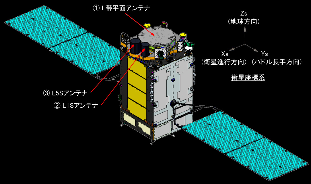 みちびき初号機後継機は、下図のようにL帯平面アンテナ、L1Sアンテナ、及びL5Sアンテナの3種類のアンテナを搭載しており、地上に向けて測位信号を送信します。